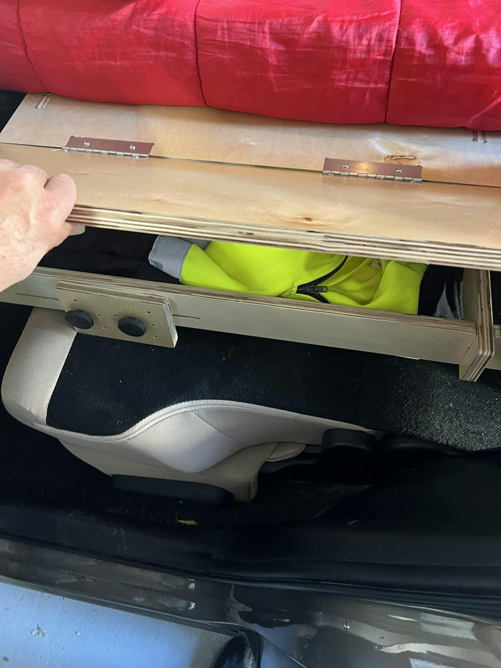 The platform is custom-made to fit the Crosstrek like a glove. The precision in its design ensures a seamless installation, utilizing every inch of available space. The platform sits perfectly flat, creating a comfortable and sturdy sleeping surface. Even with the seats folded down, it maintains a smooth, uninterrupted layout, which is a must for a good night’s sleep.