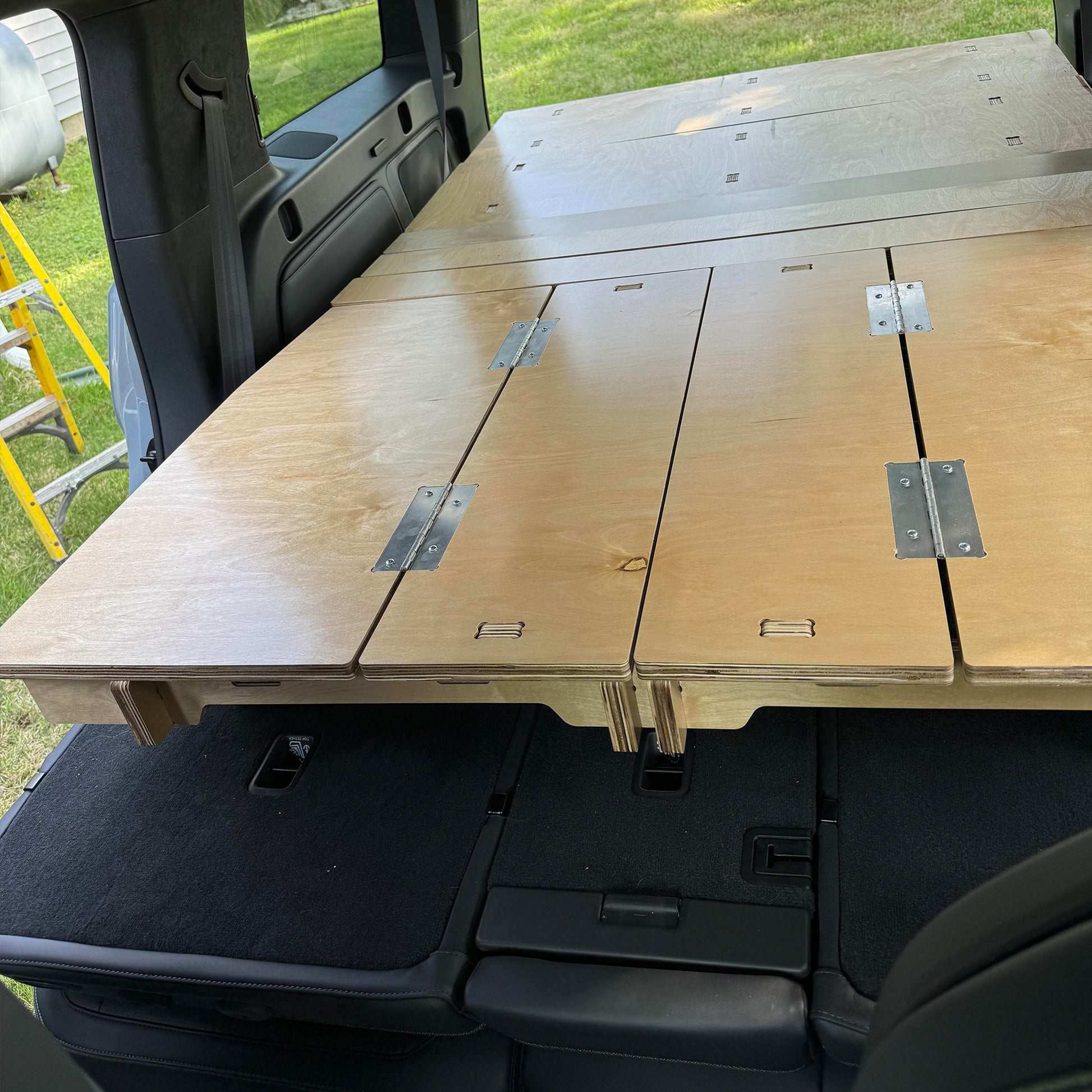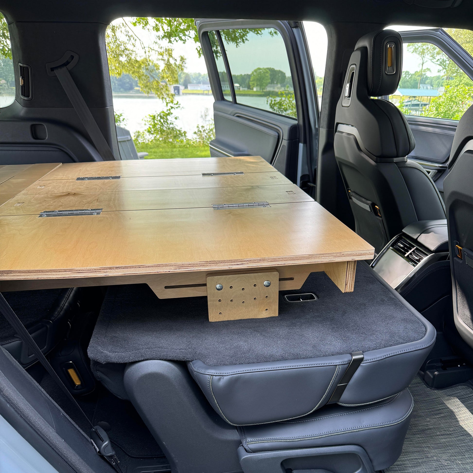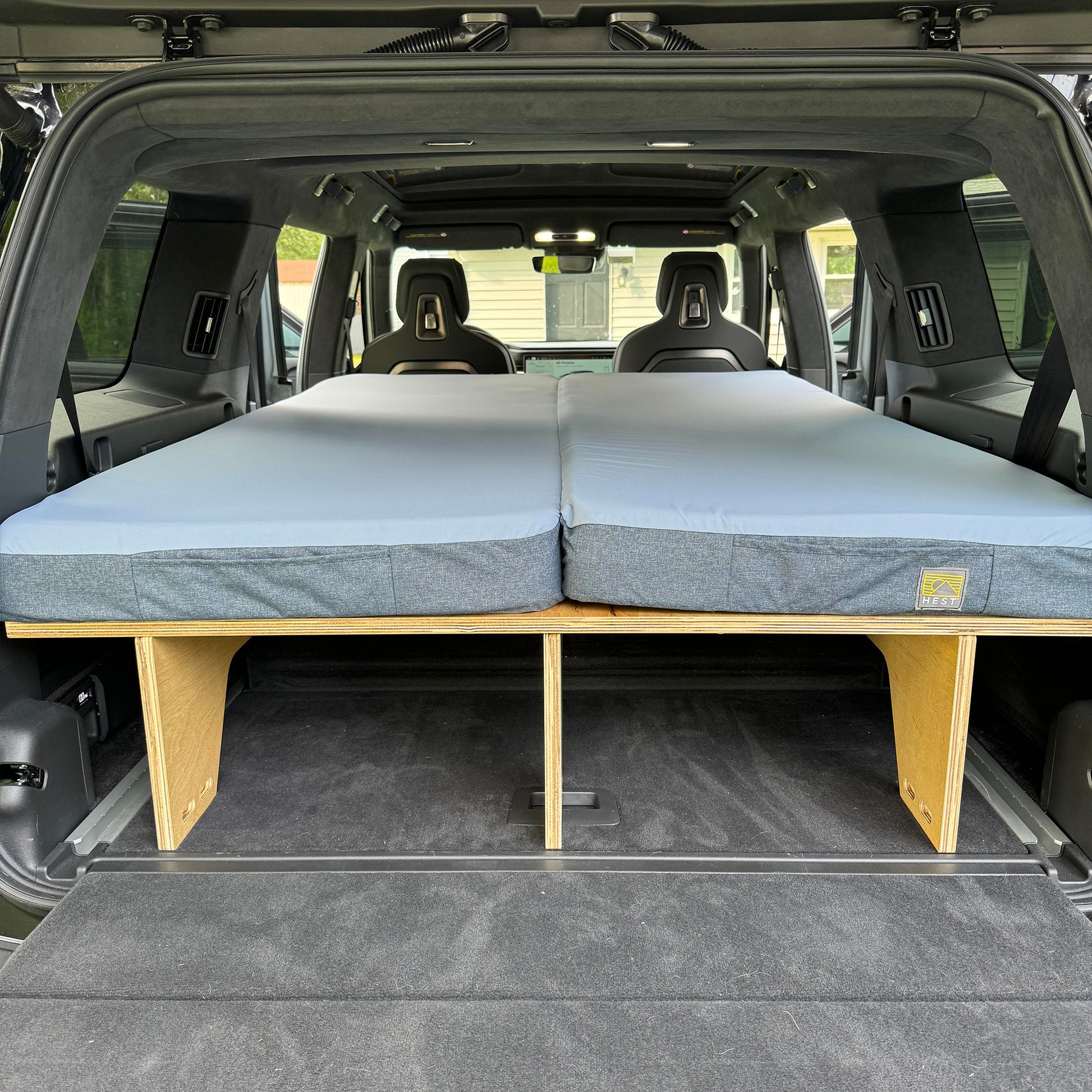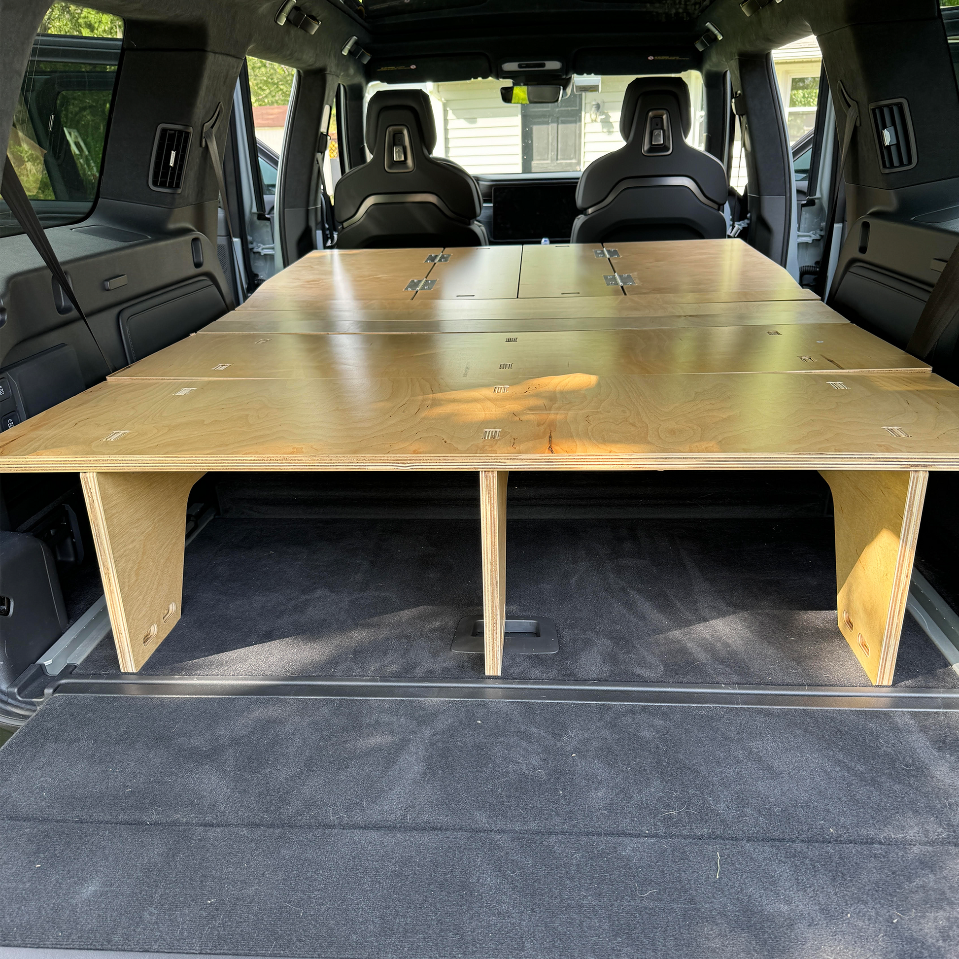 The Rivian R1S Sleeping Platform is designed to create a flat space to sleep inside your Rivian R1S and open up storage space underneath. This Sleeping Platform can be assembled and installed with no tools required in under 10 minutes. There is no permanent install or modification to your vehicle required. The Sleeping Platform features attachment points so that it can securely tied into the cargo hooks in the Rivian R1S Trunk. Deck out your Rivian R1S with this sweet camping setup today!